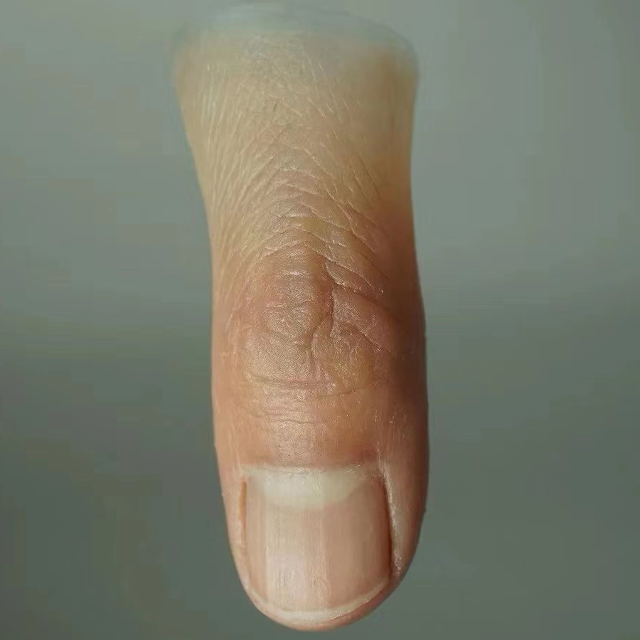 用于手指截肢的裝飾性假指。由橡膠、皮革、樹脂、硅橡膠等制作。形式多樣,起彌補(bǔ)手部外形的作用。單指截肢可以佩戴指套,多指截肢時(shí),相應(yīng)做成內(nèi)手套的形式。