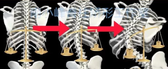 如下圖。當(dāng)脊柱是直的時(shí),天平的兩邊重量分配一樣。隨著側(cè)彎和偏移發(fā)生,天平左邊重量大,右邊小。會(huì)把脊柱不斷的拉向壞的方向。