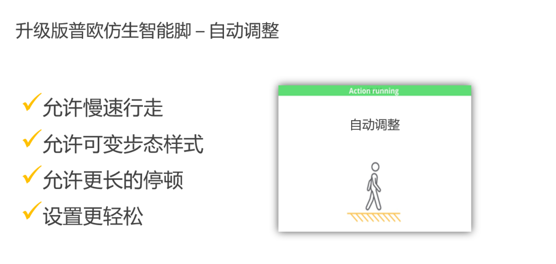 自適應功能:升級后的新普歐功能更強,用戶操作起來也更簡便快捷。允許用戶可以慢速行走;變化多種步態(tài)行走、更長的停頓感應以及更輕松的設(shè)置。