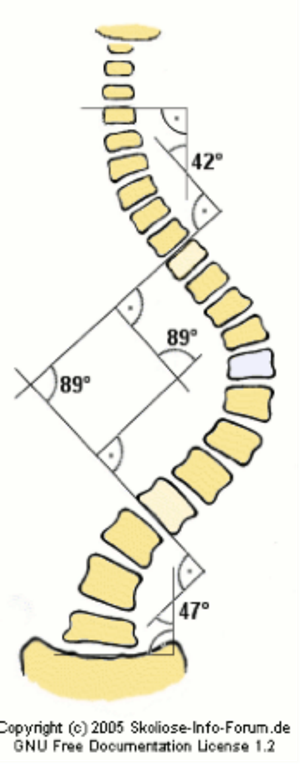在X線檢查中,我們可以測定患者的cobb角,該角度測量是通過測量脊柱上下彎曲最頂端的兩個椎體上、下緣所成的角度,來確定側(cè)彎的嚴(yán)重程度。