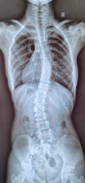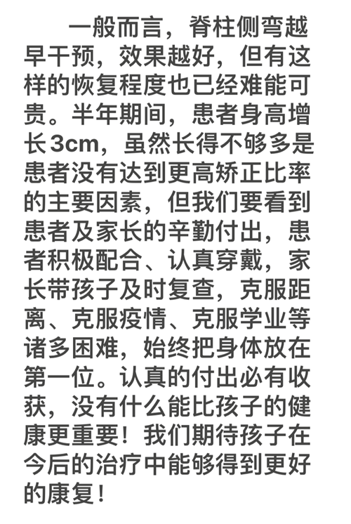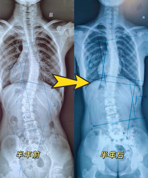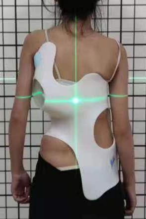 13歲女孩,2021年2月份檢查出脊柱側彎,胸26°,腰27°。制作支具后,患者沒有不舒適感,并表示愿意配合穿戴支具。每天穿戴22個小時左右,半年后,身高由150生長至153cm,脫支具24小時后拍片,側彎角度由原先胸26°,腰27°,減少至胸16°,腰17°。